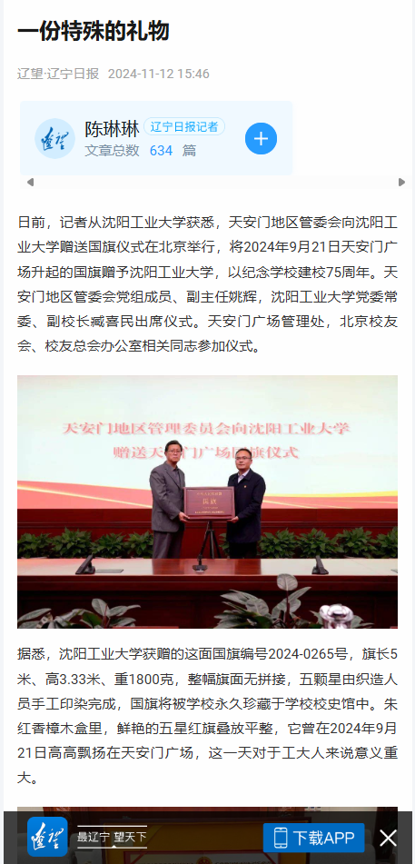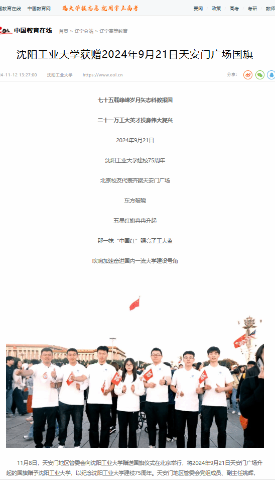 多家媒体对我校于11月8日获赠2024年9月21日天安门广场国旗进行追踪报道。