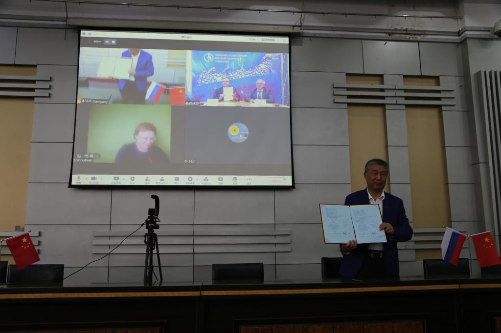 9月30日下午,中俄校际合作云签约仪式暨石油化工领域学术交流会在沈阳工业大学辽阳分校成功举行。党委副书记、校长郭连军代表我校签署合作协议,会议由党委常委、副校长陈延明主持。