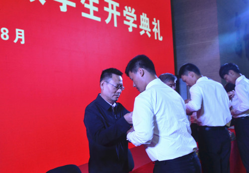 校领导为新生代表佩戴校徽