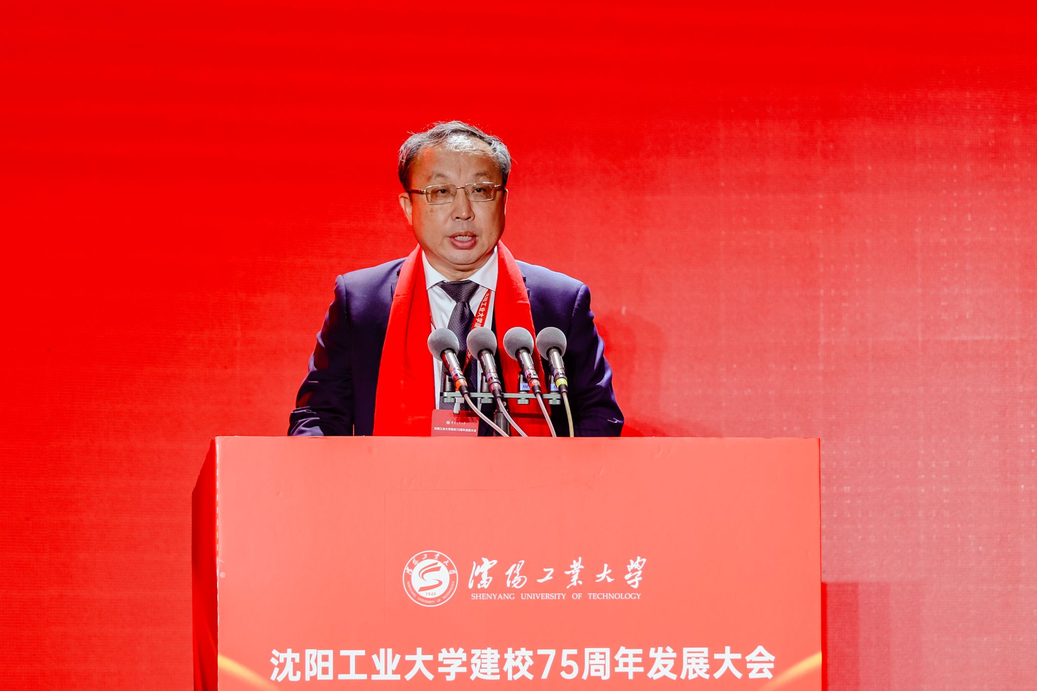 沈阳市委副书记、市长吕志成代表沈阳市委、市政府向学校全体师生员工和海内外校友表示热烈祝贺。他讲到,75年来,沈阳工业大学始终与祖国同行、与时代同步,书写了绚丽多彩的发展篇章。涌现了以唐任远院士、王立鼎院士、赵刚院士为代表的学界泰斗,培育了洪家光、盖立亚、葛丽玲等一批大国工匠,为国家输送了18万余名应用型、复合型人才,挺起了中国“工业脊梁”。创建了国家稀土永磁电机工程技术研究中心、国家级“2011”协同创新中心等多个国字号创新平台,创造了4项中国首创具有完全自主知识产权的科技成果,为国家科技进步作出了突出贡献。他指出,沈阳因装备制造、先进制造、高端制造而备受瞩目、闻名遐迩、享誉中外,这里面都有沈阳工业大学的贡献和付出。他希望学校在新的起点上,紧紧抓住沈阳建设国家中心城市,打造国家先进制造中心、综合性国家科学中心的战略契机,锚定建设国内一流大学目标,充分发挥学科优势、人才优势、科技优势,更好服务国家战略、融入地方发展,推动更多科研成果本地转化,为辽宁、沈阳全面振兴蓄势赋能。他诚挚邀请广大学子、校友多回母校看看、多到沈阳走走,积极回馈母校、更多支持沈阳。他表示,沈阳市委、市政府将一如既往地支持学校改革创新发展,在特色学科建设、科研平台运行、人才队伍培育等方面为学校提供全方位支持,携手开创校地合作、共赢发展的新局面。